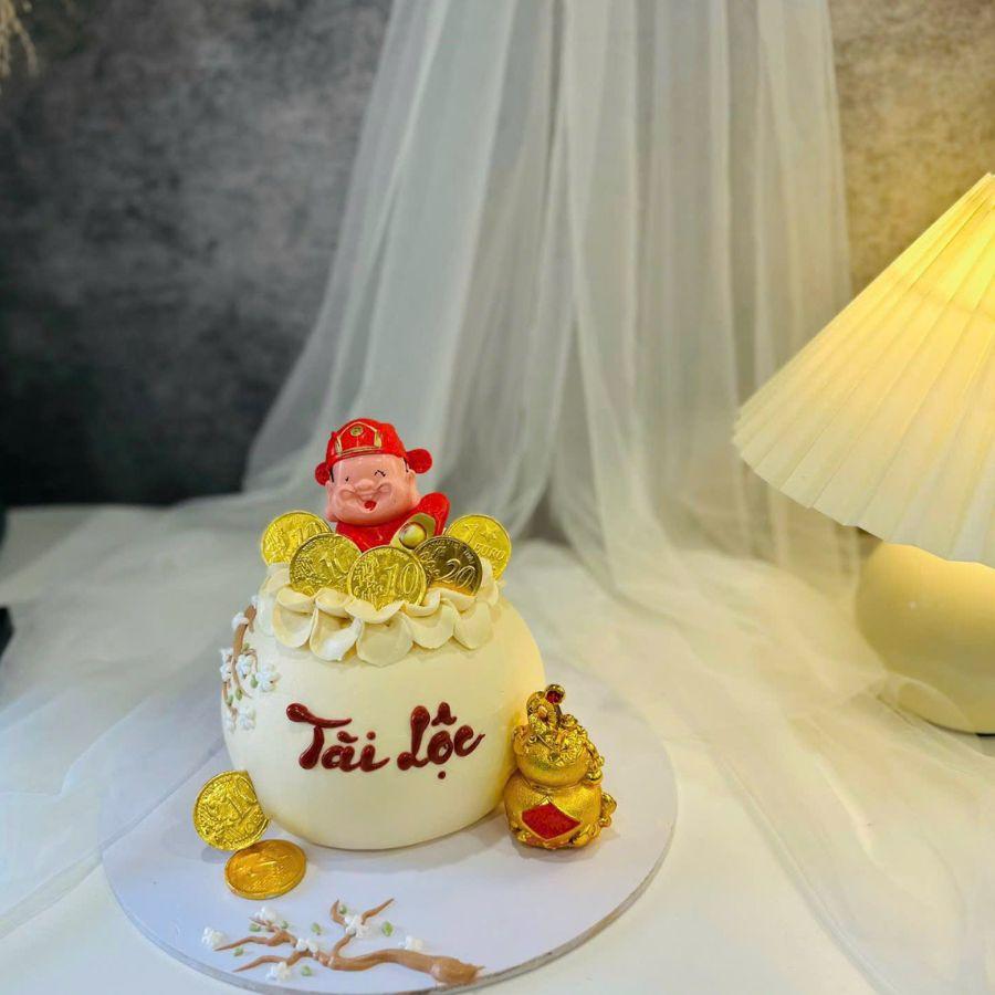 Bánh hũ vàng khai trương được gắn nhiều phụ kiện mang lại sự may mắn như mèo thần tài, hũ vàng, tiền xu, đô la,… tùy theo yêu cầu của bạn.