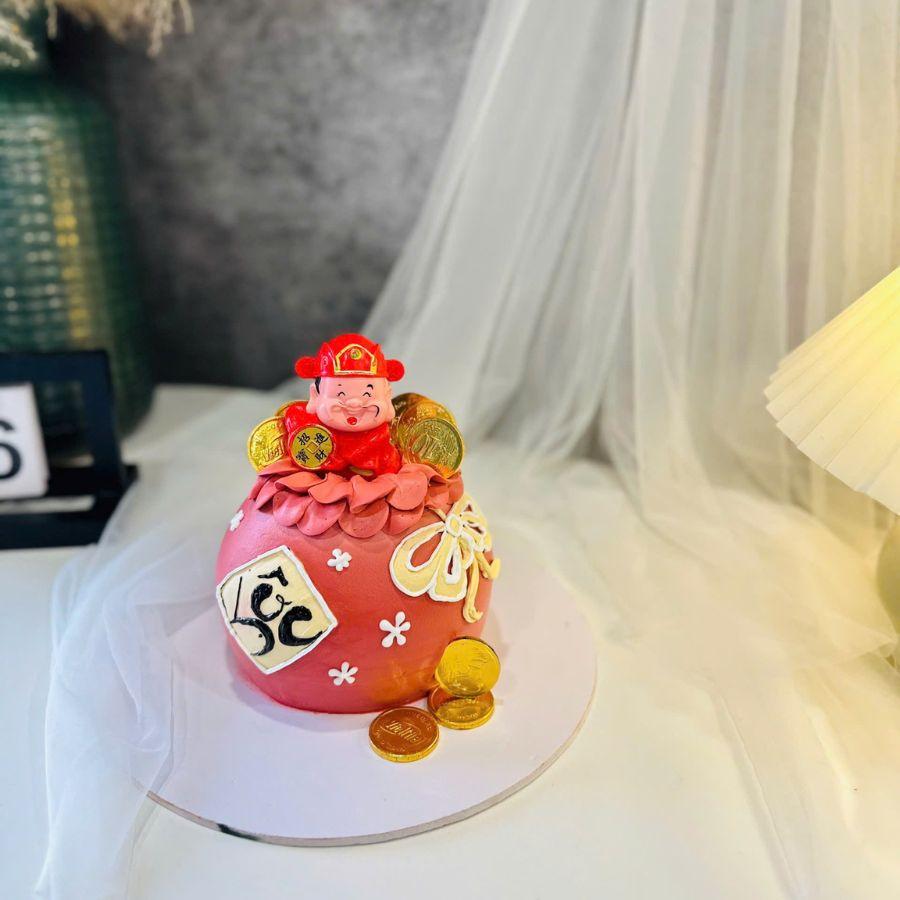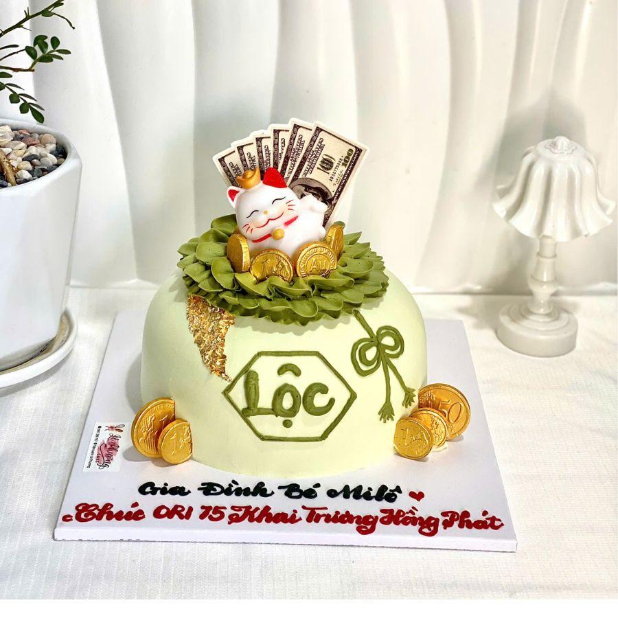 Bánh hũ vàng khai trương được gắn nhiều phụ kiện mang lại sự may mắn như mèo thần tài, hũ vàng, tiền xu, đô la,… tùy theo yêu cầu của bạn.